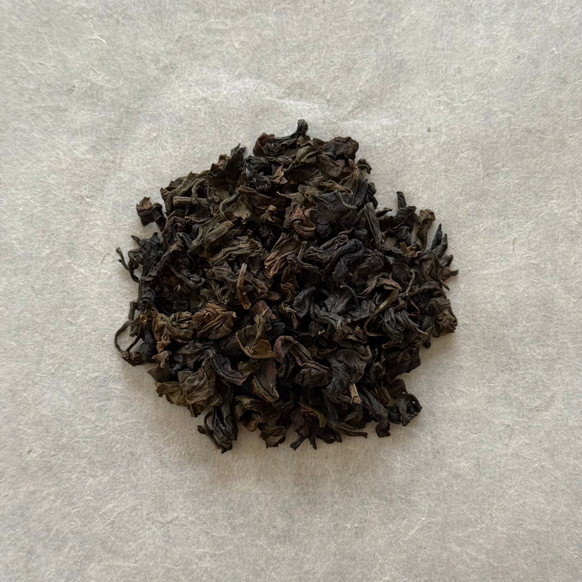 このお茶は「こうしゅん」という品種を焙煎烏龍茶に仕上げたものです。芳醇でエキゾチックな印象もある蘭のような花の香り。熟した果実の皮を噛んだ時のような、柔らかい渋みと華やかさが混じった色気のある芳香が口の中に広がります。重ね焙煎と言って焙煎をゆっくり重ねる方法で火入れがされていま す。ホットが最も香りを楽しめると思いますが、もちろん急冷や水出しも美味しいです。