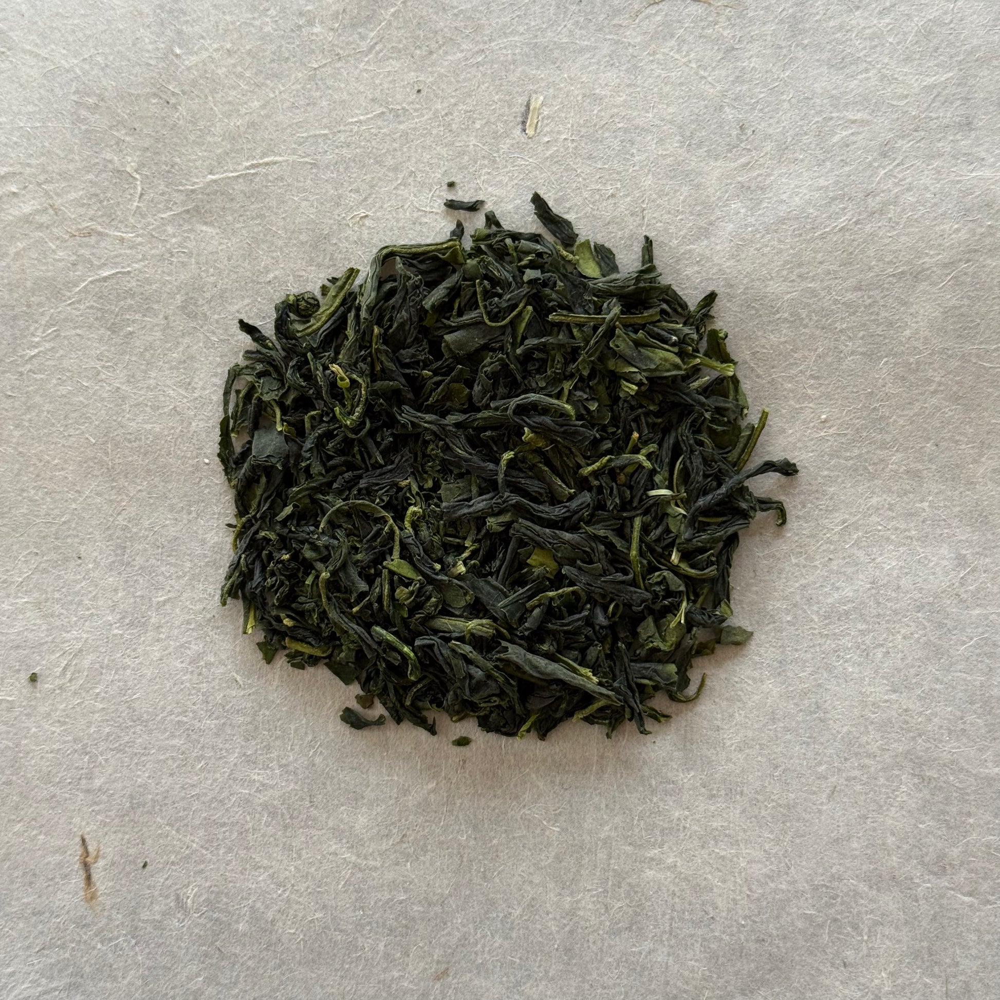 このお茶は「おくみどり」という品種から作られた釜炒りの緑茶です。口あたりはすっきり、 優しい甘みと柔らかい旨みが広がり、滋味深い味わいを穏やかに感じます。夏頃まではパパイヤのようなフルーティな青い香りを感じ、秋口以降は青みが落ち着き森林浴のような穏やかで深い緑感が出てきます。熱湯で抽出時間を短めにさっぱり淹れても、少し冷ましてとろりと甘く淹れても美味しいです。