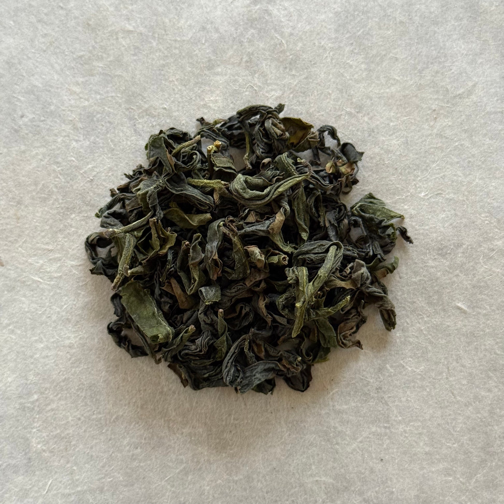 このお茶は「みなみさやか」という品種の焙煎をかけていない烏龍茶です。クチナシのような強い花 の香りと弾けるようなジューシーな柑橘、また桃のような甘い香りを持ちます。酸化発酵を軽めに仕上げることで繊細で青々しい花の香りを綺麗に感じます。抽出は熱湯で、短め(1分ほど)で煎を重ねて淹れて頂くのがおすすめです。どっしり渋みを出したければ、もちろん長めでも◎水出し との相性も抜群です。
