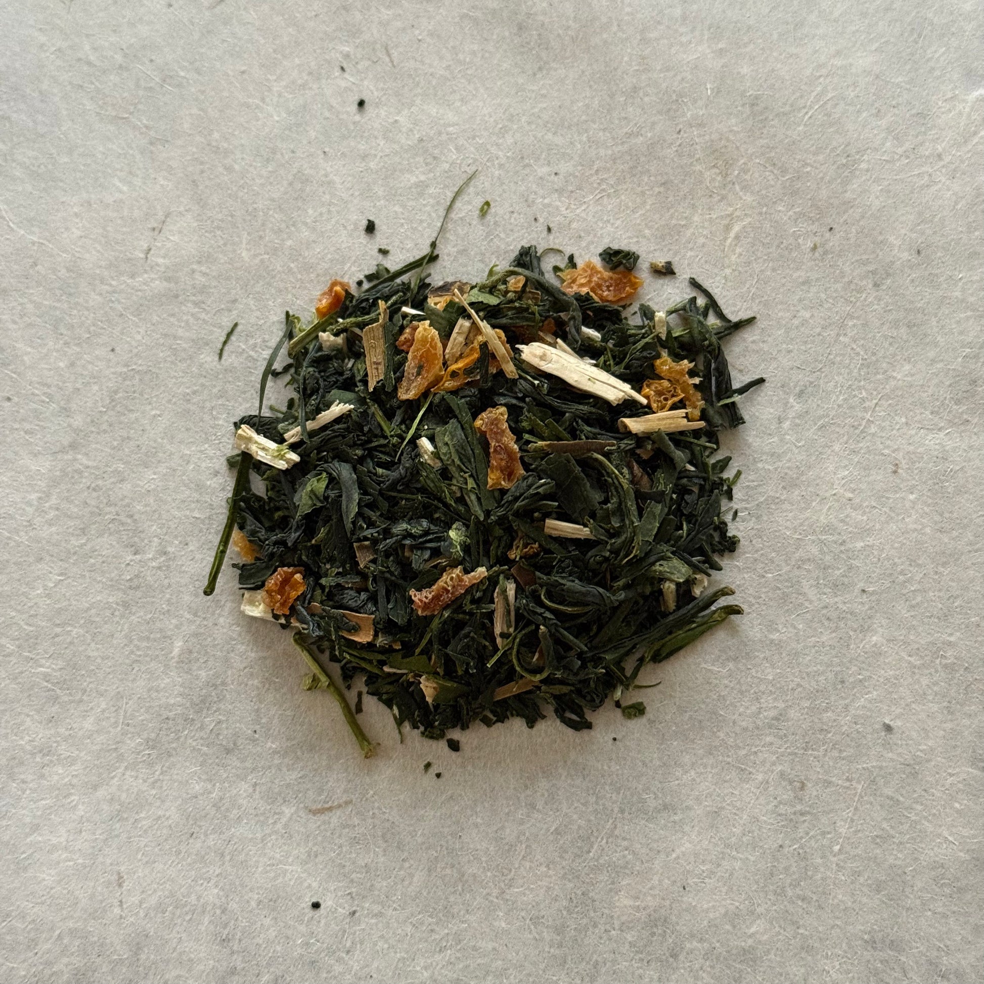 煎茶と釜炒り茶、二種の緑茶に黒文字と柚子をブレンド。柑橘、山椒のような香りが新年のピリッとした気持ちの良い朝を想わせます。熱湯でも気軽に抽出できるのでお食事と合わせても。お正月料理に合い、冬の寒い日がよく似合うブレンドです。