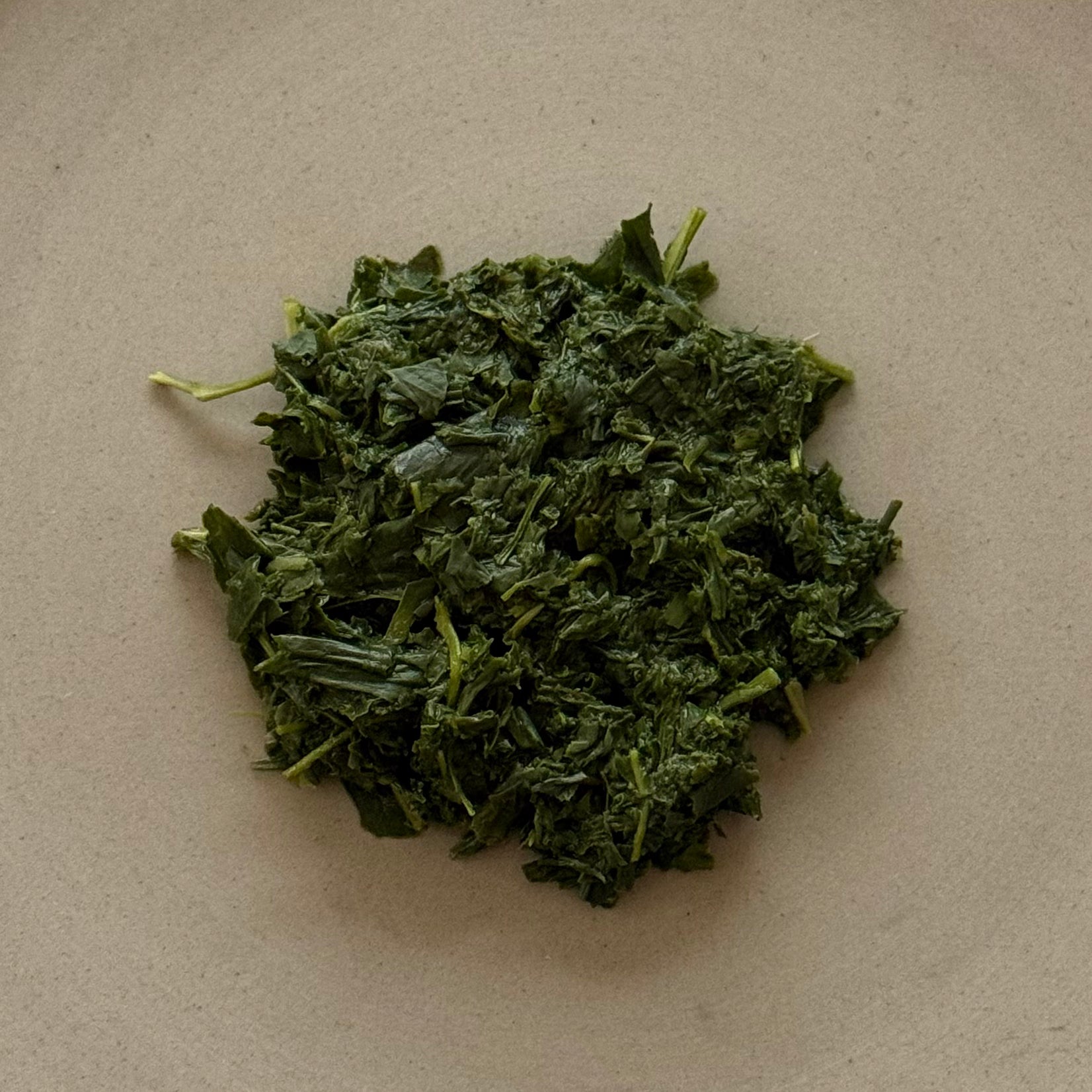 このお茶は「あさつゆ」という品 種を煎茶に仕上げたものです。このお茶を口に含むとショートケー キが頭に浮かびます。まろやかで渋みがなく、ほんのり穀物感のあるミルキーさの中に、苺を連想させる柔らかい青み。蒸しも深すぎないのでまろやかなだけでなく、キレもあってしつこくない。冬によく似合う緑茶です。抽出はお好みで すが80-90度ほどで。抽出時間は 1分~1分半。二煎目以降もサッと 淹れてぜひ楽しんでください。